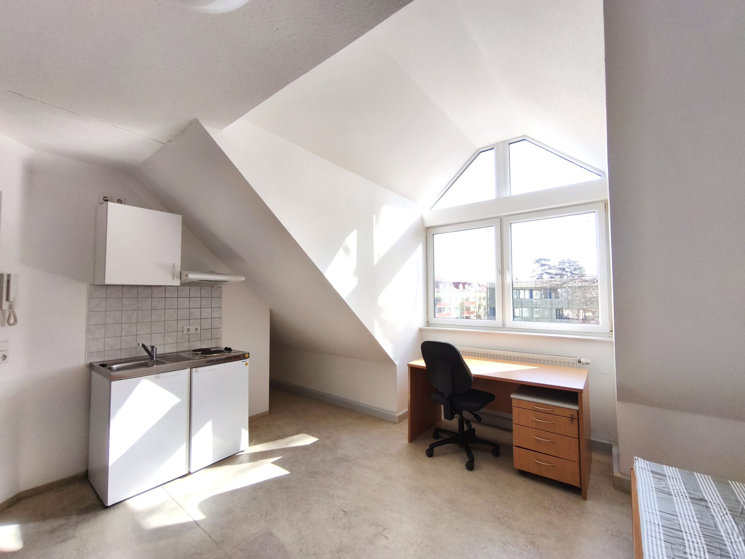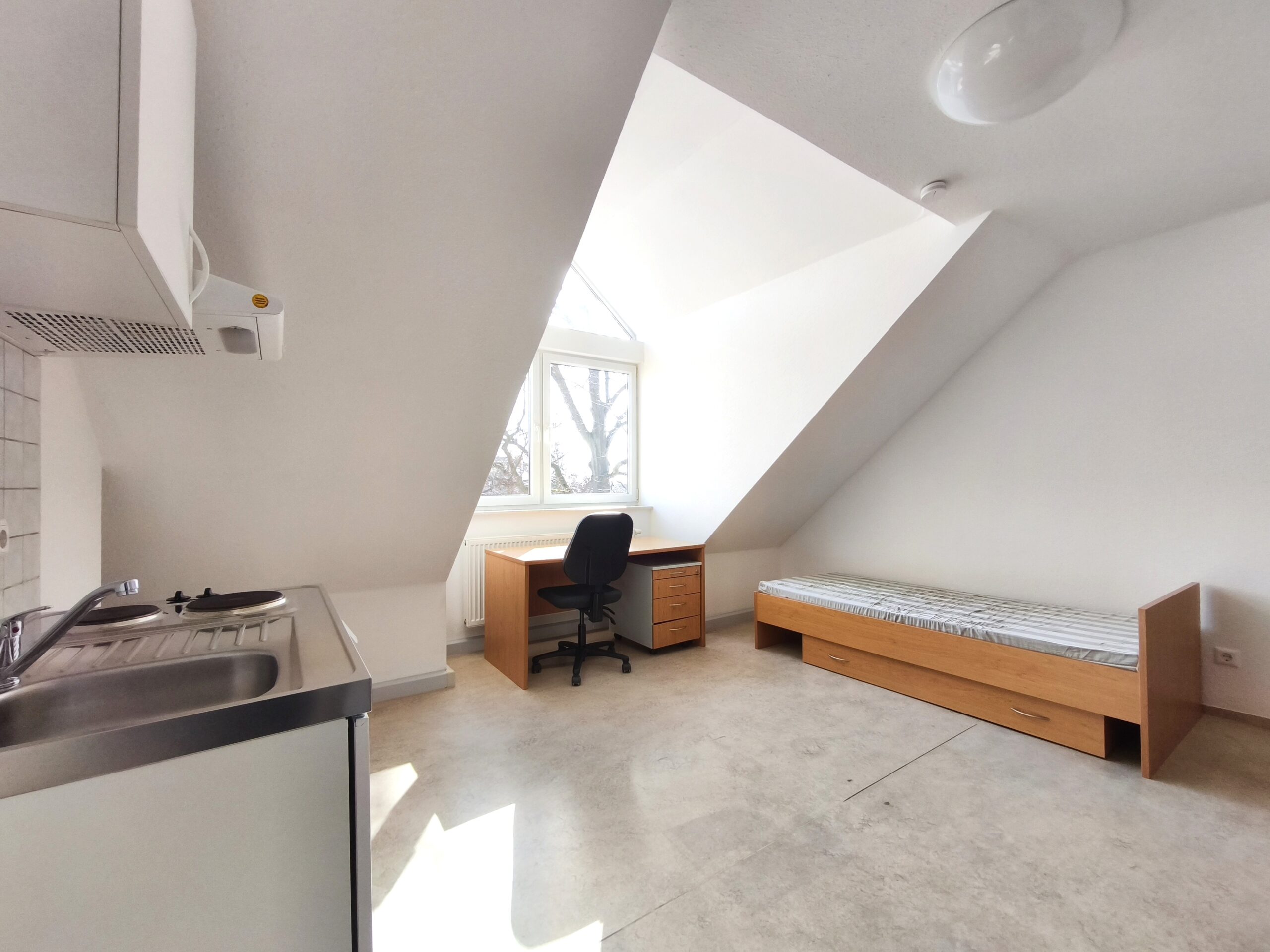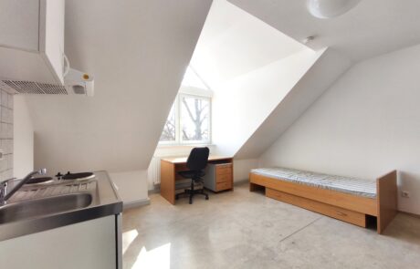 Our residential complex is located directly on campus, opposite the spacious "Schwanenteich" park, and is only a few minutes' walk from the canteen and library. The four modernised houses belonging to the complex are laid out around a spacious, green inner courtyard. Here in the courtyard area, our tenants have two barbecue areas for celebrating, a table tennis table and several car parking spaces. Further parking spaces are available on the surrounding streets.