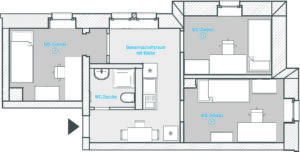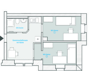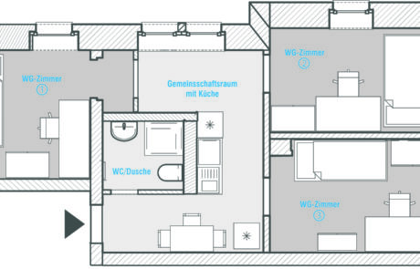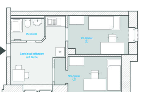 Our Feldstraße residential complex is in a quiet, green location, just a few minutes' walk from the university campus and the railway station. The building at Feldstraße 17/19 is currently being renovated and will be ready for occupancy in the winter semester 2026/2027. Shared flats for 2 and 3 people will be created there, with one shared flat for 2 and one shared flat for 3 people per entrance on each floor. This means that the Feldstraße 17/19 building will offer a total of 40 students space to sleep, study and celebrate and will also have: